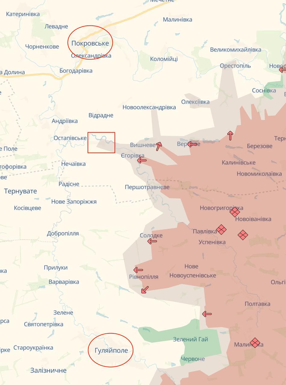 За його словами, російське командування прагне обійти Гуляйпільський район оборони з півночі та перерізати ключові комунікації, які ведуть до нього з боку Покровського. Якщо нинішній темп просування збережеться, росіяни можуть спробувати вийти до річки Гайчур та дороги Гуляйполе–Покровське, а потім наблизитись до Покровського з південного сходу.