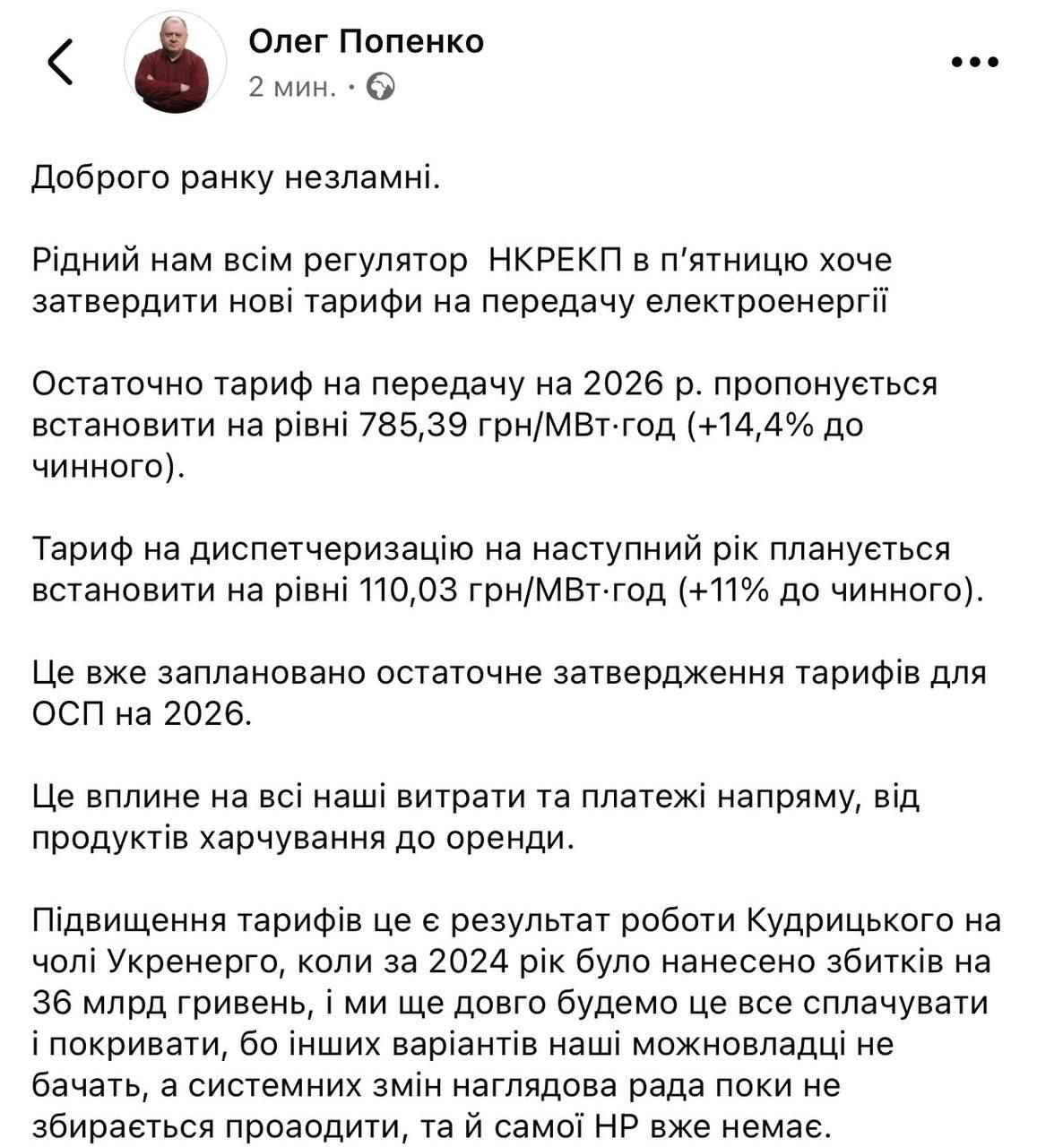 "Це вплине на всі наші витрати та платежі напряму, від продуктів харчування до оренди. Це результат роботи Кудрицького на чолі "Укренерго", коли за 2024 рік було завдано збитків на 36 млрд гривень, і ми ще довго це все оплачуватимемо", - пише Попенко.