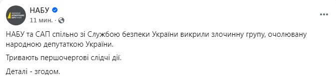 Незабаром після публікації ЗМІ НАБУ офіційно заявило, що разом із САП та СБУ викрило злочинну групу, яку очолює народний депутат. Слідчі дії продовжуються, сказано в публікації, подробиці Бюро пообіцяли розповісти пізніше.