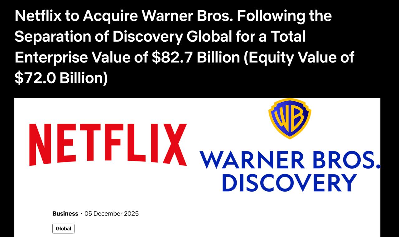 Американський стрімінговий сервіс Netflix оголосив про покупку великого концерну з виробництва фільмів та телесеріалів Warner Bros. за 82,7 мільярда доларів. На цей актив претендували Comcast та Paramount.