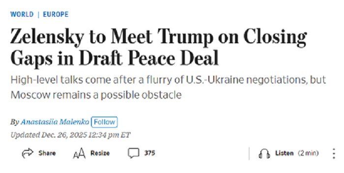 За інформацією видання, Зеленський наполягав на зустрічі з Трампом для врегулювання розбіжностей щодо проекту 20-пунктної мирної угоди та інших елементів мирного договору, які обговорюються між Україною та США, зокрема з питань Донбасу.