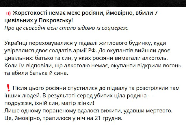Згідно з цією інформацією, у ніч на 21 грудня двоє російських військових увірвалися до підвалу житлового будинку, де ховалися мирні жителі.