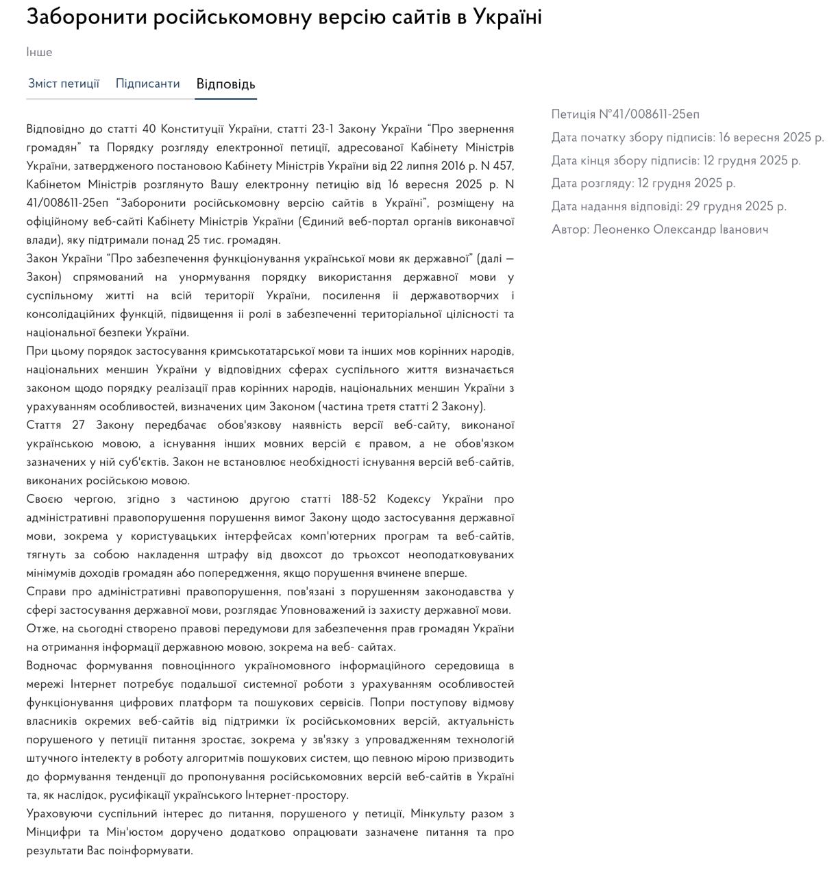 "Водночас формування повноцінного україномовного інформаційного середовища в мережі Інтернет потребує подальшої системної роботи з урахуванням особливостей функціонування цифрових платформ і пошукових сервісів. Незважаючи на поступову відмову власників окремих веб-сайтів від підтримки їх російськомовних версій, актуальність піднятого в петиції питання зростає, зокрема, в систем, що до певної міри призводить до формування тенденції до пропозиції російськомовних версій веб-сайтів в Україні і, як наслідок, русифікації українського інтернет-простору. З огляду на суспільний інтерес до питання, порушеного у петиції, Мінкультури спільно з Мінцифрою та Мін'юстом доручено додатково опрацювати зазначене питання та поінформувати вас про результати", - звернулася Свириденко до автора петиції.