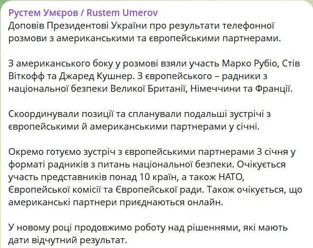 "Скоординували позиції і спланували подальші зустрічі з європейськими та американськими партнерами в січні. Окремо готуємо зустріч з європейськими партнерами 3 січня у форматі радників з національної безпеки. Очікується участь представників понад 10 країн, а також НАТО, Європейської комісії та Європейської ради. Також очікується, що американські партнери підключатимуться онлайн", – написав Умеров.