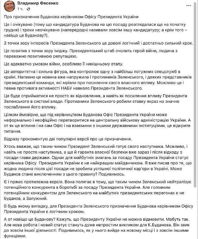 "Хтось вважає, що таким чином президент Зеленський готує свого наступника (на посаді президента - Ред. ). Можливо, і навіть не просто наступника, а ще й гаранта власної безпеки вже зараз і після звільнення з посади глави держави. Однак для майбутніх змагань за посаду президента України статус керівника Офісу президента України є не найкращим майданчиком. Я вже писав в Україні. Може Буданов стане винятком із цього правила?
