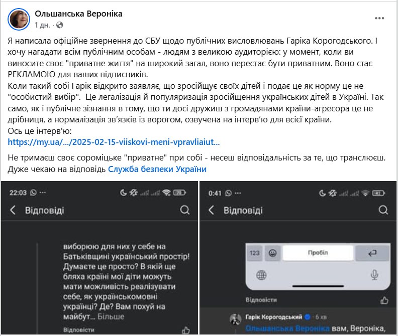 "Я написала офіційне звернення до СБУ з приводу публічних висловлювань Гарика Корогодського… Коли такий Гарік відкрито заявляє, що русифікує своїх дітей та подає це як норму, це не "особистий вибір". Це легалізація та популяризація обрусіння українських дітей в Україні", – написала вона.