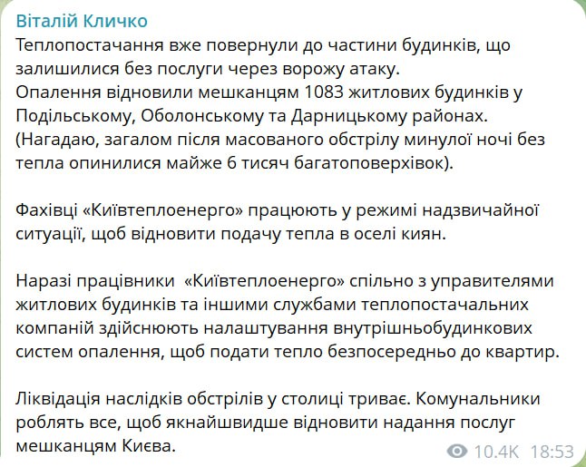 Мер столиці також повідомив, що опалення відновлено у 1083 житлових будинках у Подільському, Оболонському та Дарницькому районах.