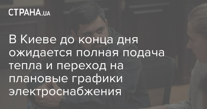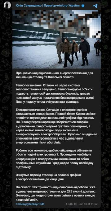 "Теплогенеруючі об'єкти подають теплоносій у житлові будинки, триває поетапний запуск подачі безпосередньо в квартири. Повну подачу тепла очікуємо вже сьогодні. Ситуація з електроенергією залишається складною. Правий берег Києва майже повністю переведений на планові графіки відключень. На Лівому березі поки що зберігаються аварії. електропостачання до кінця дня", - пише Свириденко у своєму Telegram-каналі.