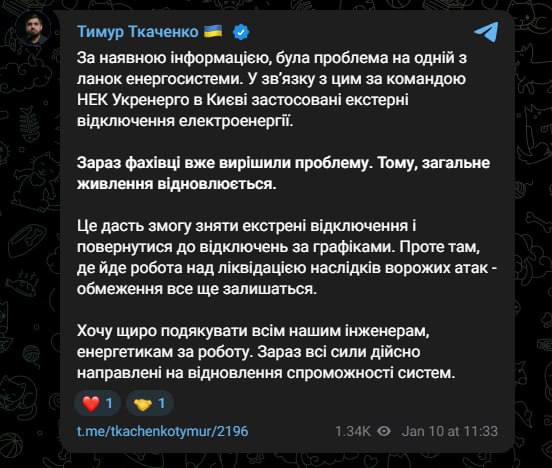 "Була проблема на одному з ланцюгів енергосистеми, проблему вирішили. Електроживлення відновлюється. Це дасть можливість зняти екстрені відключення та повернутися до графіків. Оскільки ведеться робота з ліквідації наслідків атаки, обмеження все ще залишаються", - заявив Ткаченко.