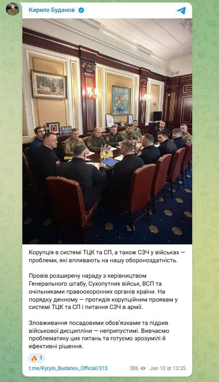 "Я провів розширену нараду з керівництвом Генерального штабу, Сухопутних військ, ВСП та головами правоохоронних органів країни. На порядку денному — протидія корупційним проявам у системі ТЦК та СП та питання СОЧ в армії. Зловживання службовими повноваженнями та підрив військової дисципліни — неприпустимі. рішення", - написав Буданов.