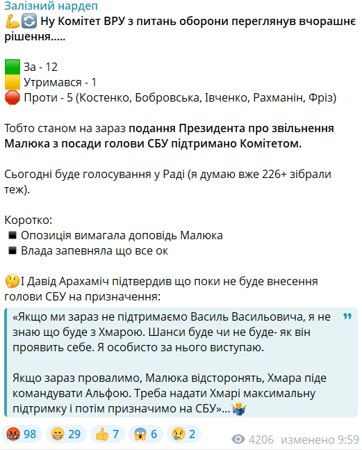 А стверджувати нового постійного голову СБУ поки не будуть, підтвердив голова фракції "Слуга народу" Давид Арахамія: "Шанси будуть чи не будуть – як він проявить себе. Я особисто за нього виступаю. Якщо зараз провалимо, Малюка усунуть, Хмара піде командувати "Альфою". Потрібно надати Хмарі максимальну".
