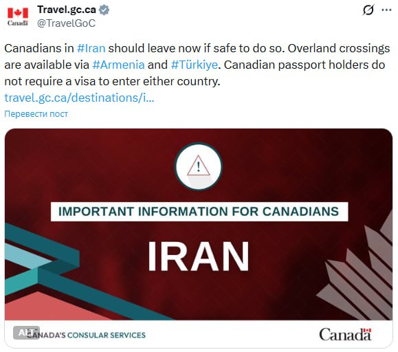 Тим часом Канада закликає своїх громадян терміново залишити Іран.