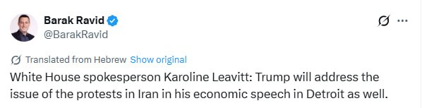 Тим часом журналіст порталу Axios Барак Равід із посиланням на прес-секретаря Білого дому Керолайн Лівітт повідомив, що Дональд Трамп торкнеться теми протестів в Ірані у своїй економічній промові в Детройті.