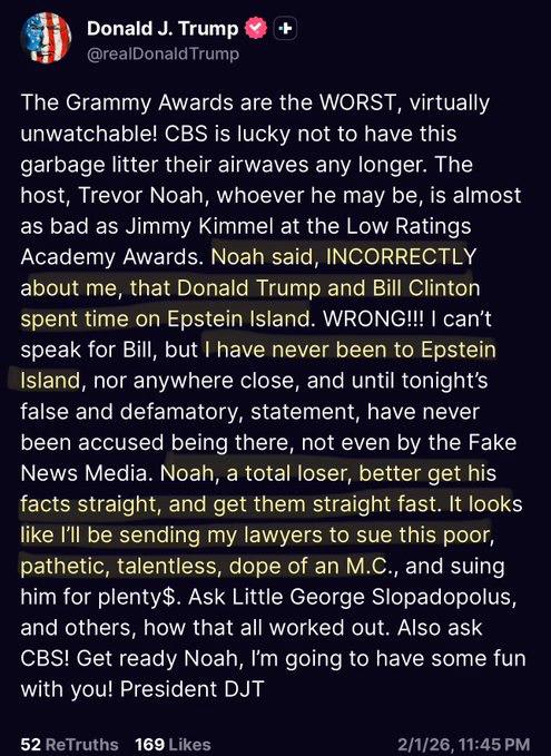 "Пісня року" - це "Греммі", яку кожен артист хоче отримати майже так само сильно, як Трамп хоче Гренландію, що цілком логічно, адже острів Епштейна зник, і йому потрібен новий, щоб тусуватися з Біллом Клінтоном", - заявив Ноа.