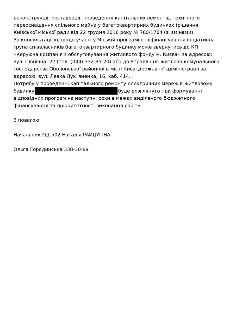 "У місті Києві діє Програма співфінансування реконструкції, реставрації, проведення капітальних ремонтів, технічного переоснащення спільного майна в багатоквартирних будинках. Необхідність проведення капітального ремонту електричних мереж у житловому будинку №*** на проспекті *** буде розглянута при формуванні відповідних програм на наступні роки в межах виділеного бюджету" йдеться у повідомленні.